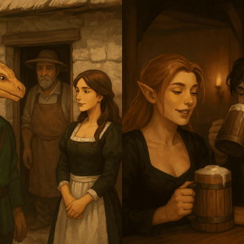 In der Abenteurergilde angekommen, verkaufte die Gruppe ihre zehn Scherben des Antiillusionsspiegels und ließ sich anschließend entspannt bei einem Bier nieder. Die Ruhe wurde jedoch gestört, als eine Gruppe Kultisten die Gilde betrat und ohne viele Worte die Treppe zu den oberen Räumen hinaufstieg. Torga zog sich auffällig zurück, was sofort die Aufmerksamkeit der Gruppe weckte. Schnell entschieden sie sich, sich zu tarnen: Morgan und Namyra nahmen andere Gestalten an, Sternenflügel machte sich unsichtbar und half Akra, ihre Schuppen rot zu färben. Nami und Yoru hingegen blieben unverkleidet – sie waren den Kultisten unbekannt. Besonders auffällig war eine Gestalt in der Mitte der Gruppe: ein „funky“ wirkender Typ, dessen Auftreten nicht so recht zum düsteren Rest passen wollte. Als die Kultisten wieder verschwanden, sprachen einige der Gruppe Torga direkt darauf an, doch er wich ihren Fragen aus. Schließlich widmete sich die Gruppe wieder ihrem eigentlichen Ziel, nahm die Aufträge „Spuk in der Scheune“ und „Spielzeug verschwunden“ an und kündigte an, bald nach Steinhalt aufzubrechen – inklusive eines Pakets, das sie von Torga mitnehmen sollten.