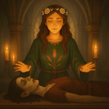 Weiter ging es zum Tempel der Göttin Sune, der auf einem kleinen Hügel lag, umgeben von Blumen. Dort traf die Gruppe auf eine junge Maid ohne Namen, die sie Nami nannten. Sie arbeitete für Valtheris, den Wächter des Tempels – ein höflicher Mann, dem die Gruppe jedoch nicht vollends vertraute.