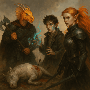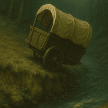 Auf dem Weg durch die Wälder westlich von Breithalt stieß die Gruppe auf verzweifelte Hilferufe, die zwischen den Bäumen widerhallten. Eine Karawane war in Not – die Pferde eines der Wagen waren durchgegangen und hatten das Gefährt gefährlich nah an eine kleine Böschung gezogen. Ohne zu zögern eilten Akra, Morgan und Namyra zur Hilfe und fanden den Wagen, wie er bedrohlich über dem Abhang schwebte, drohend in die Fluten des darunterliegenden Flusses zu stürzen.