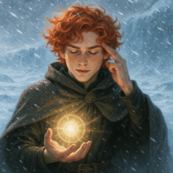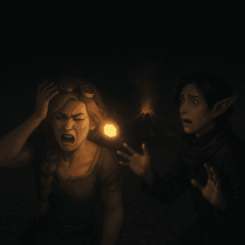 Selenia versuchte mit kleinen Zaubern wie Prestidigitation die Winterkleidung der Gruppe zu erwärmen, doch der eisige Wind blieb erbarmungslos. Stundenlang wanderten sie durch dunkle, schneebedeckte Berglandschaften, einzig geleitet vom fernen Glühen der brennenden Berge.