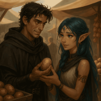 Maria versuchte, sich einzubringen, wurde von Sigil jedoch höflich, aber bestimmt, als fachlich unqualifiziert zurückgewiesen. Ein Tiefling, der das Gespräch mitverfolgte, stellte sich als Mel vor, der gesuchte Händler für magische Gegenstände.